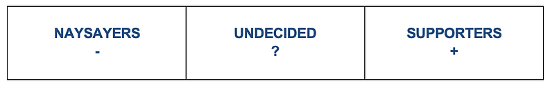 A better approach is to assume that everyone is a supporter, if you do this you will find that half of your Naysayers will become positive and half your naysayers will leave because they don’t fit in. All of your Undecided will become Supporters as well because they crave the stability, clarity and positivity that you will be providing.